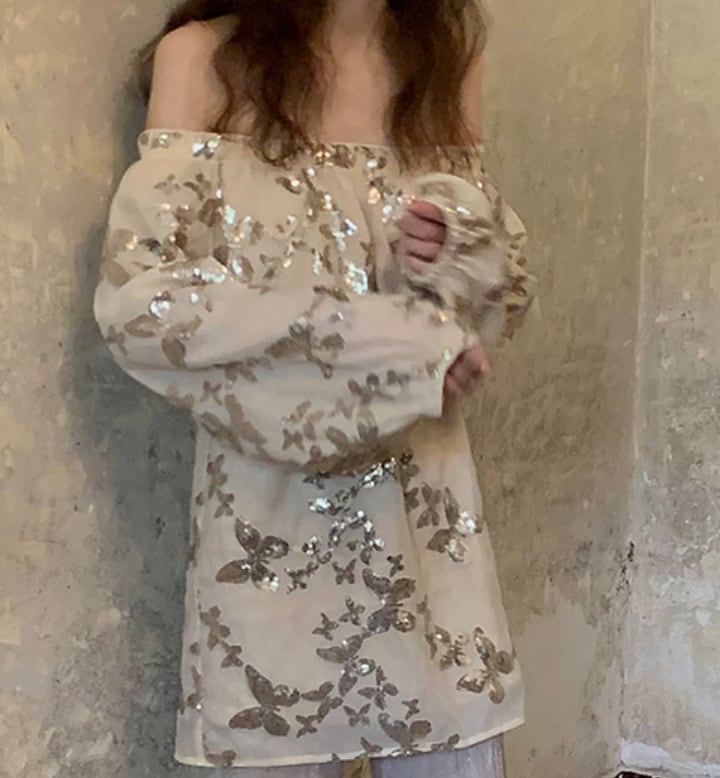 透け素材の光沢スパンコールモチーフの、華やかなオフショルダーブラウス。