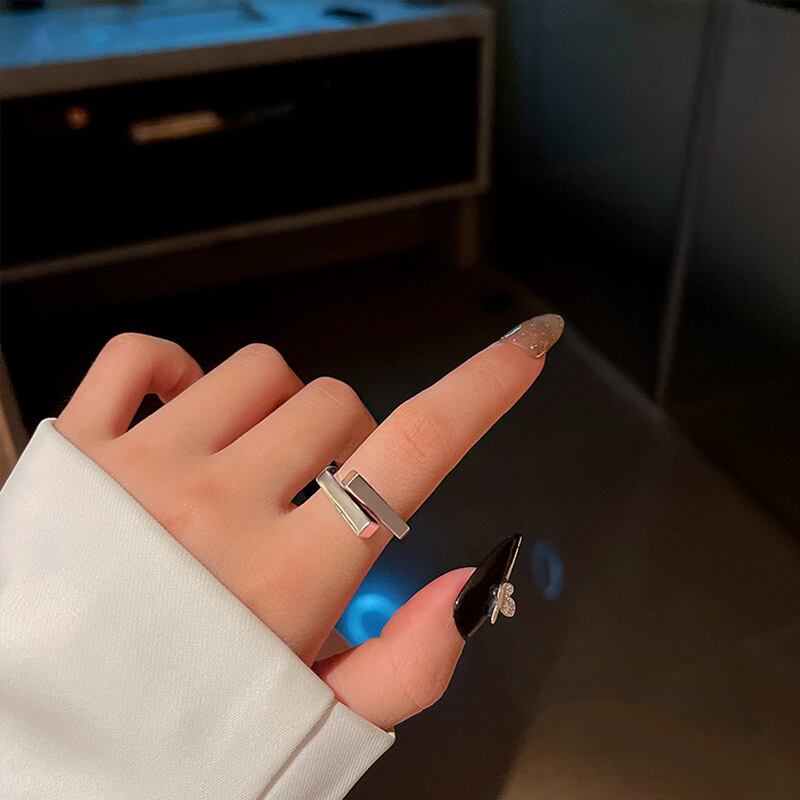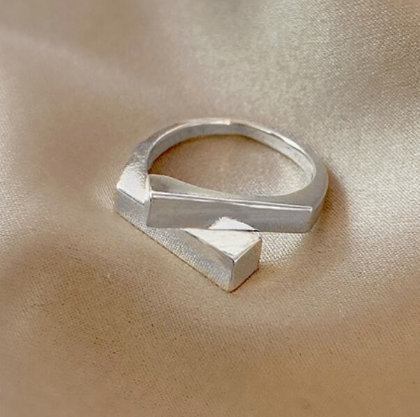 スクエアが重なった スタイリッシュな印象与える フリーサイズのシルバーリング 。
