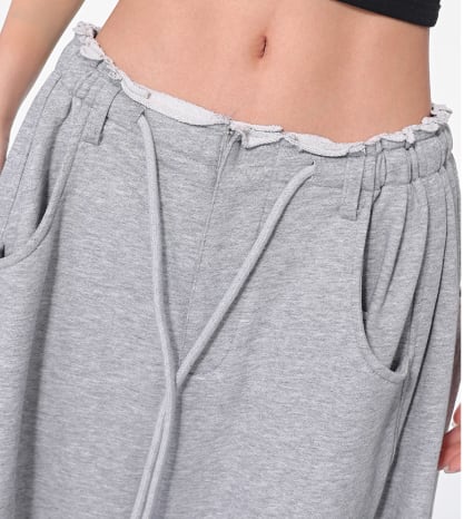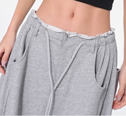 ウエスト上端はロール状、ドローストリングギャザー仕様の抜け感があり、