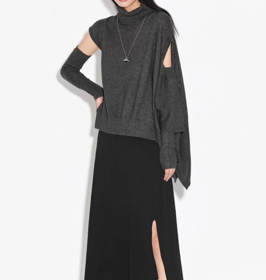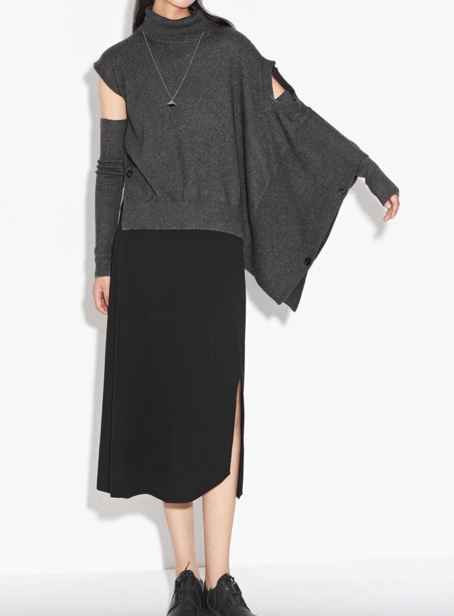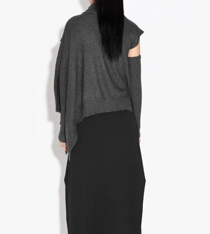 右袖はノースリーブ、左袖はマント状になっているアシメトリーな羽織ニット。
