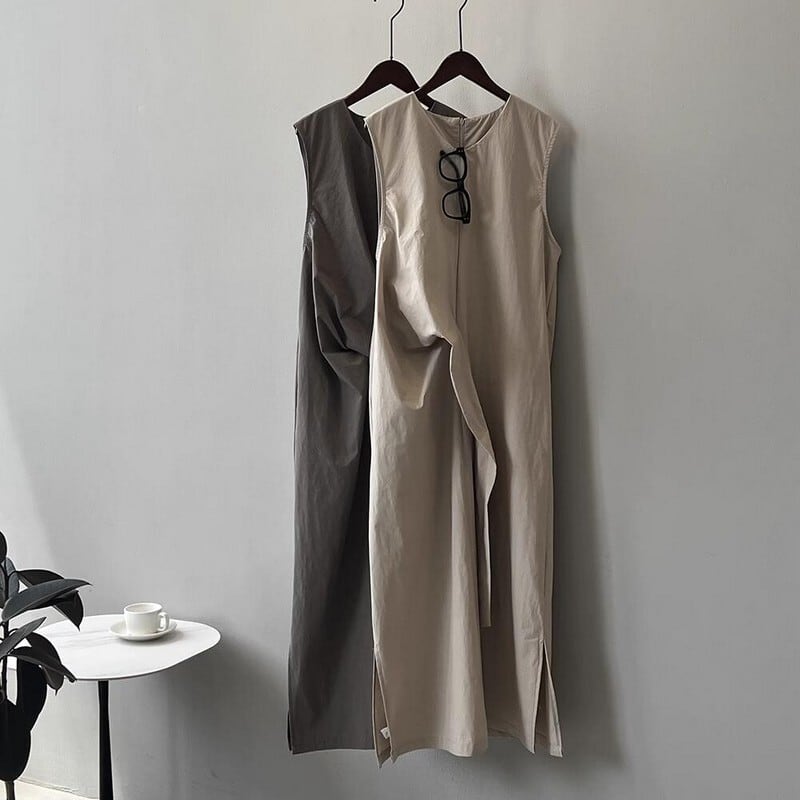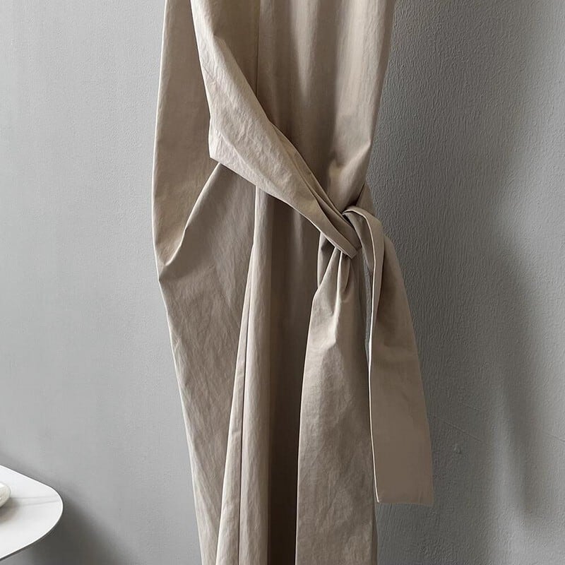 シンプルでAラインシルエットに ウエストサイドに結ぶアクセント付きのワンピース。