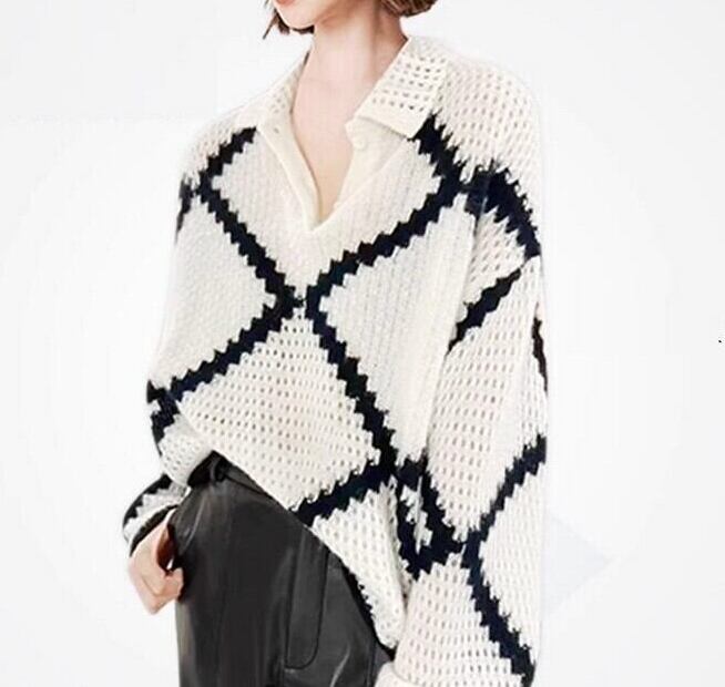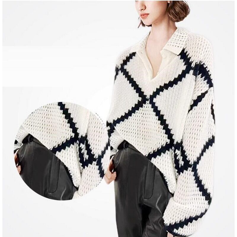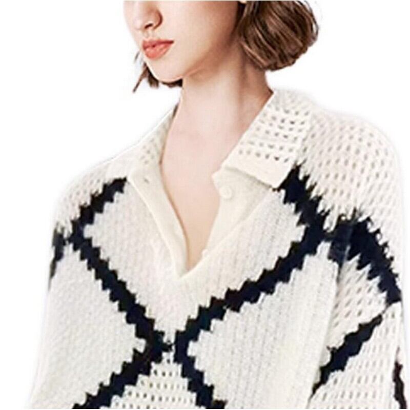 たっぷりシルエットの メッシュセーターが 斜めブロック柄と融合した、