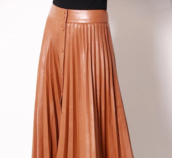 光沢あるPU素材のハード目素材でありながら、フェミニンなプリーツラインスカート。