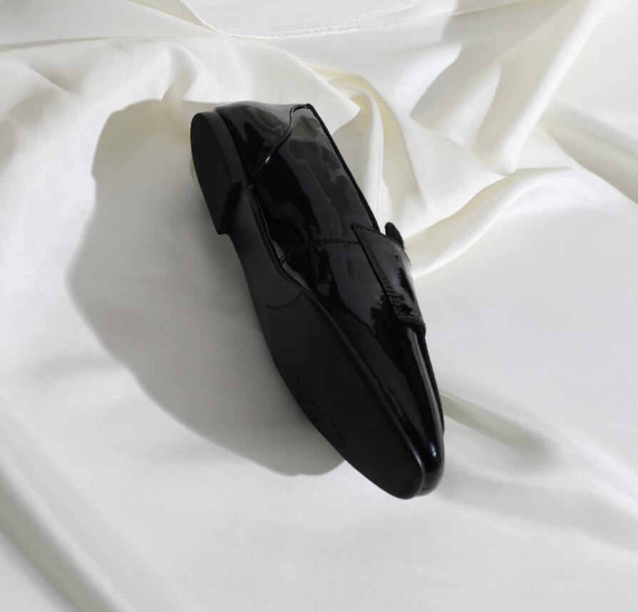 飾りベルトが特徴的な エナメル調光沢入った ローヒールローファー。