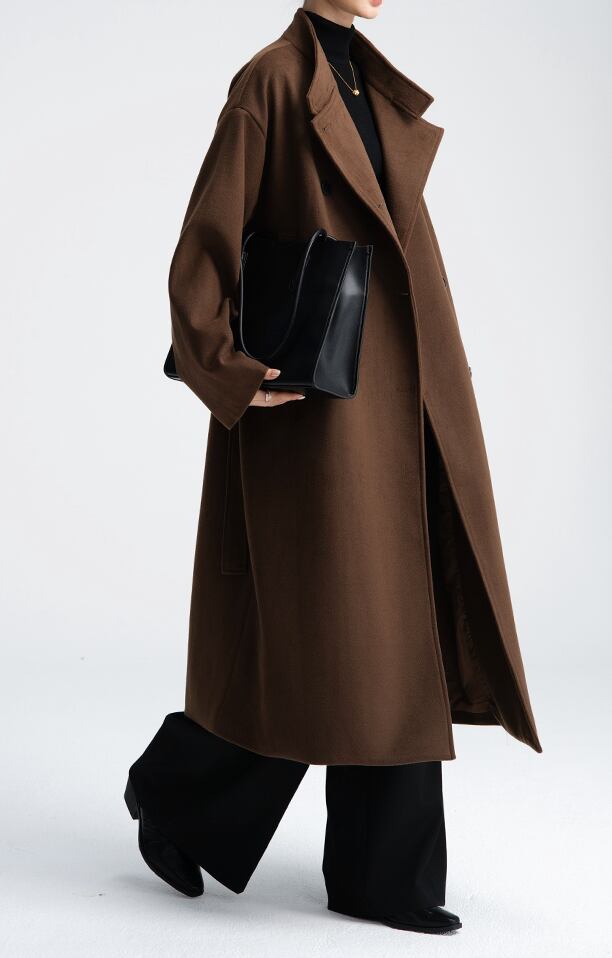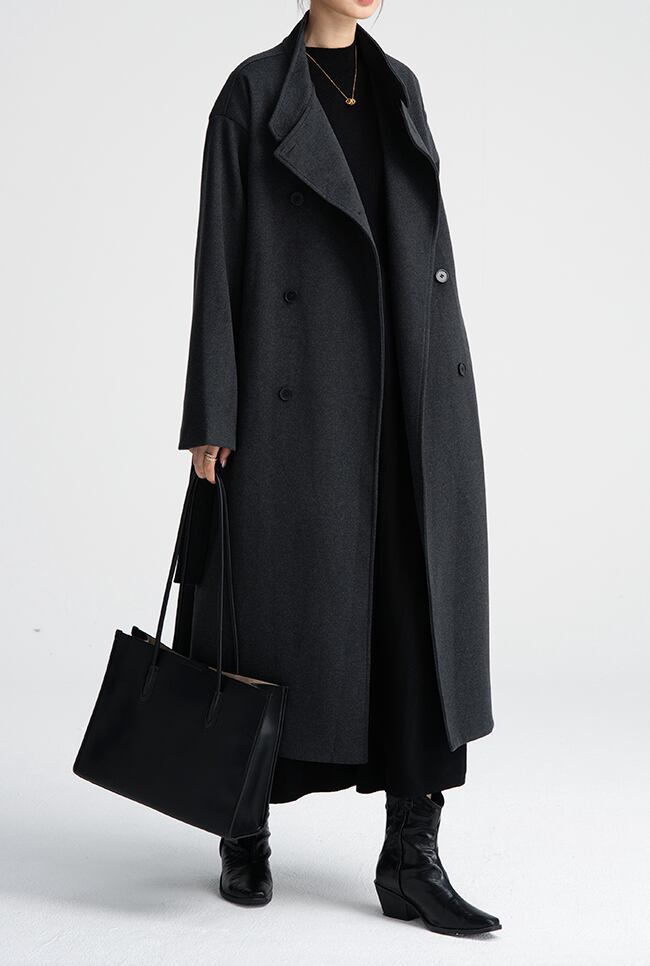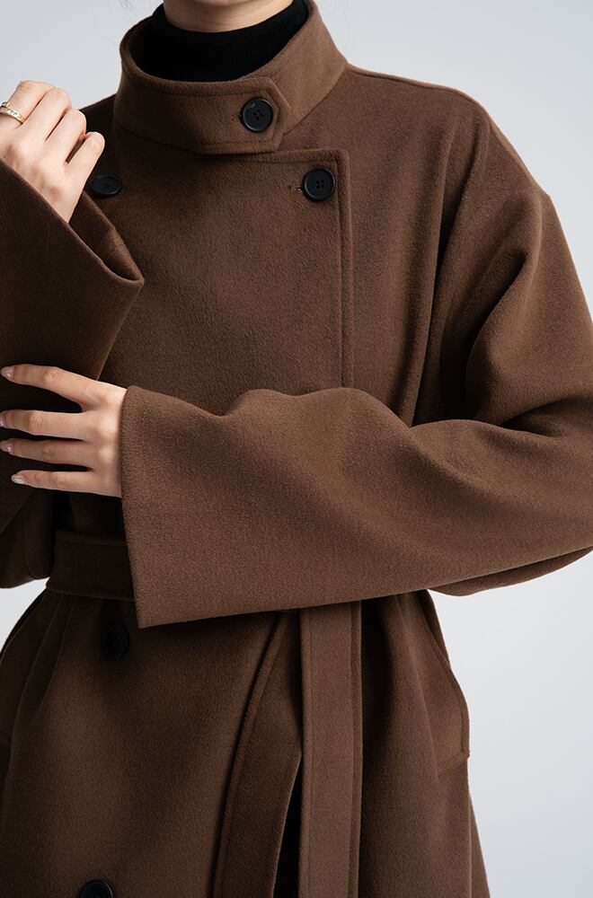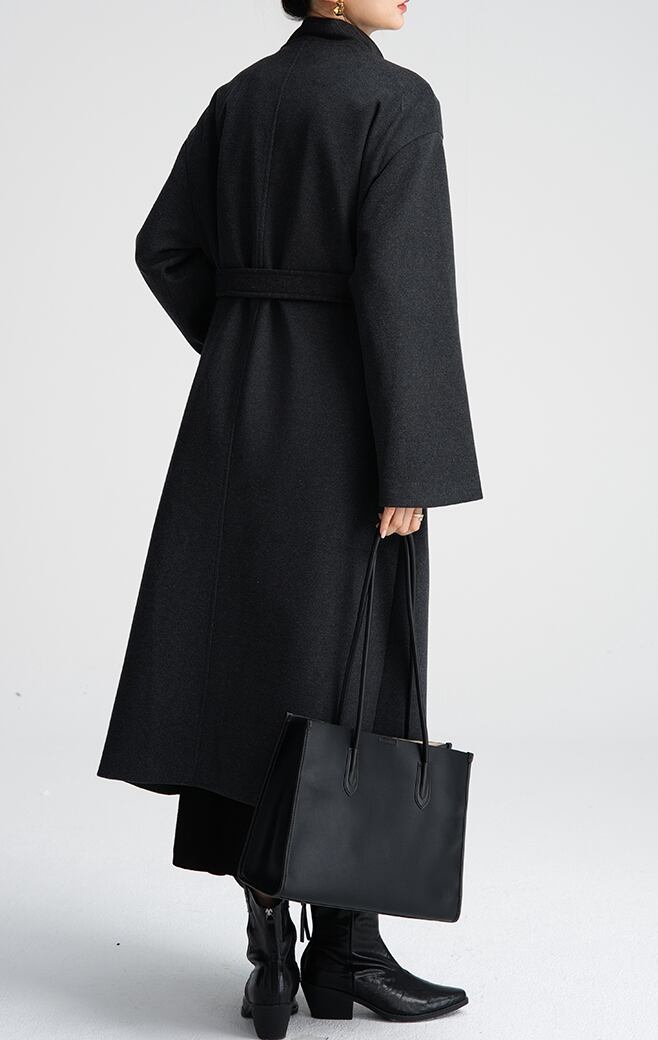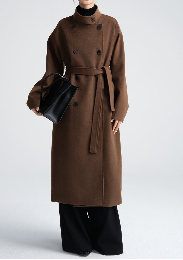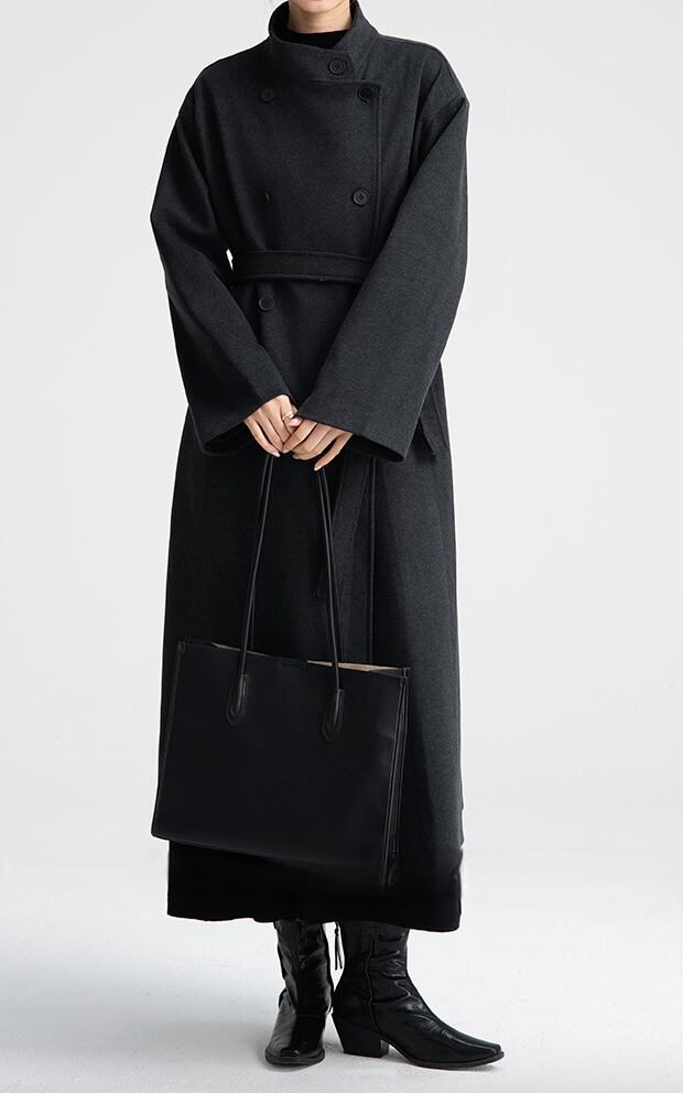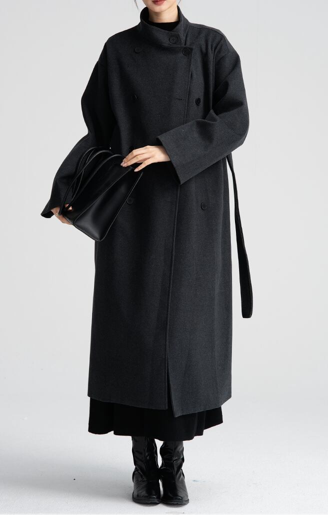 スタンドカラーのシックなデザインが特徴の、ベルト付ロングコート。