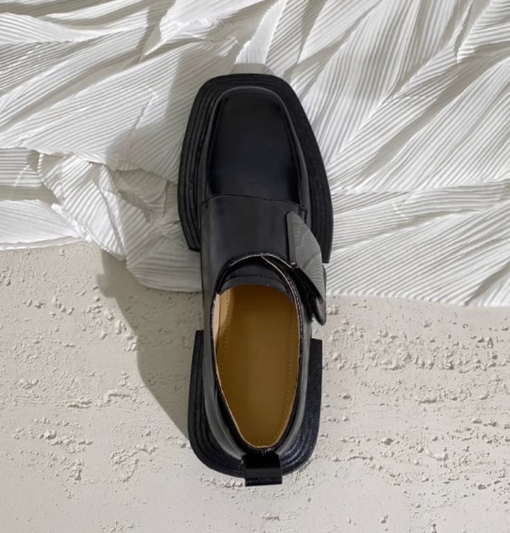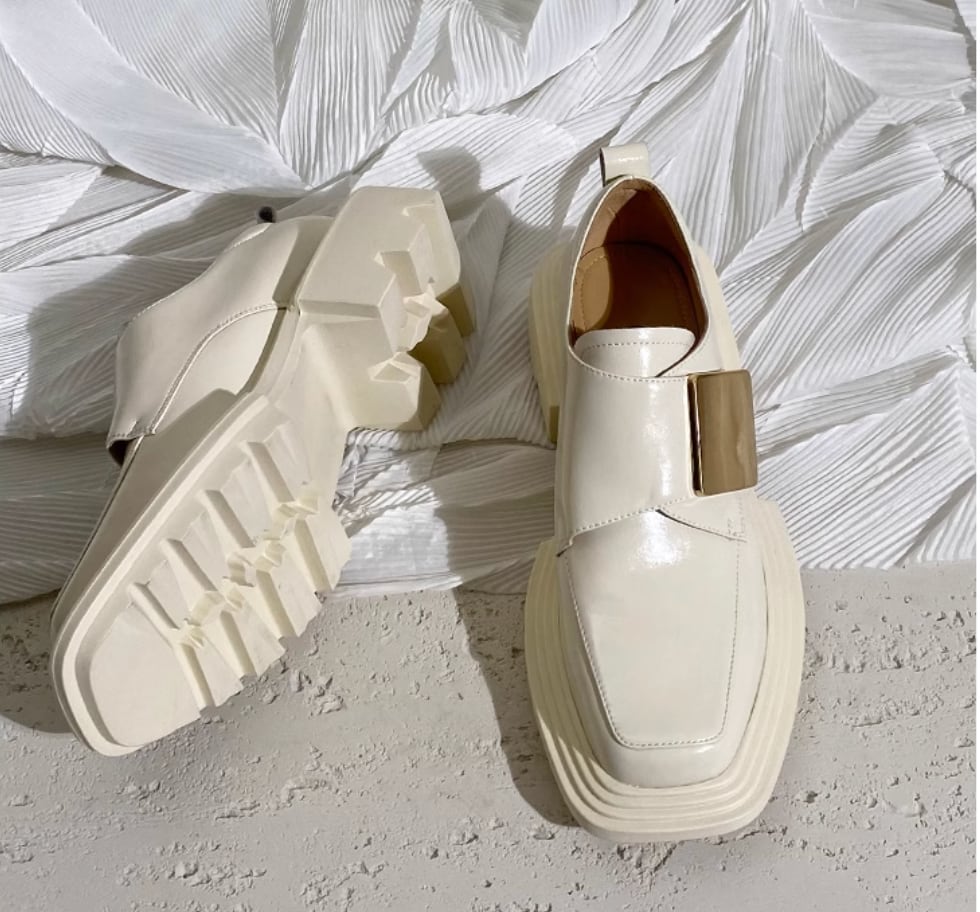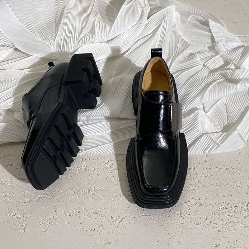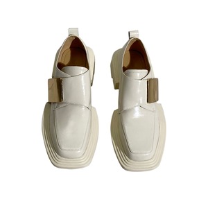 スクエアメタルがポイント開きになった、厚底レザーシューズ。